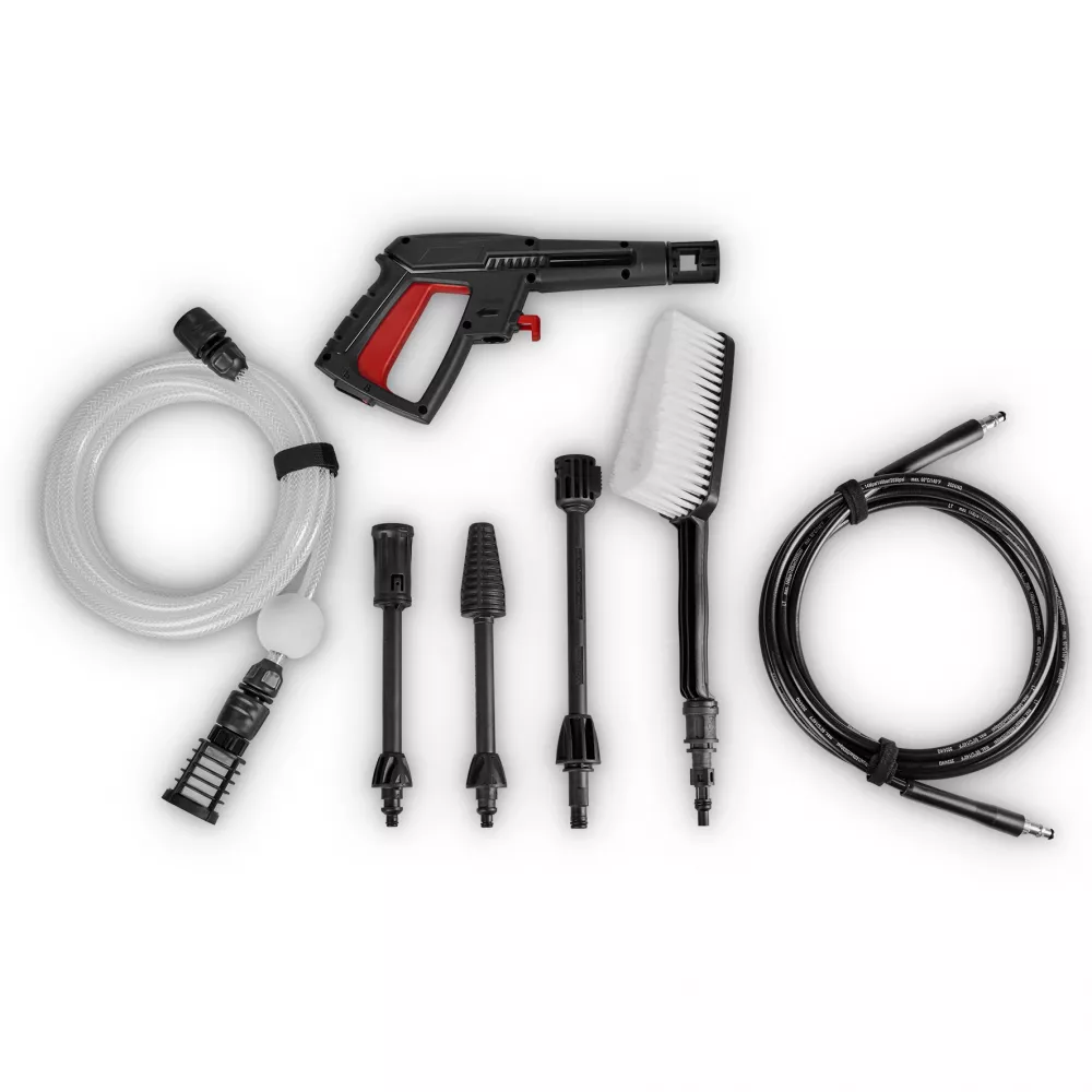 Багата комплектація: У комплекті вже йде шланг подачі води (5 м) з фільтром, пінна насадка для нанесення шампуню та сітчаста сумка для зберігання аксесуарів.