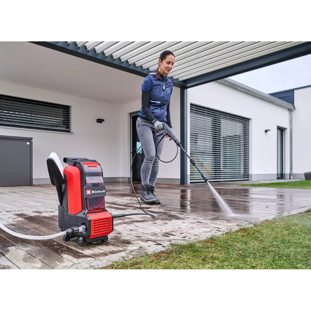 Потужність 105 Бар: Високий тиск і потік води 320 л/год забезпечують ефективне видалення бруду, що робить цю модель найпотужнішою в класі акумуляторних ручних мийок Einhell.