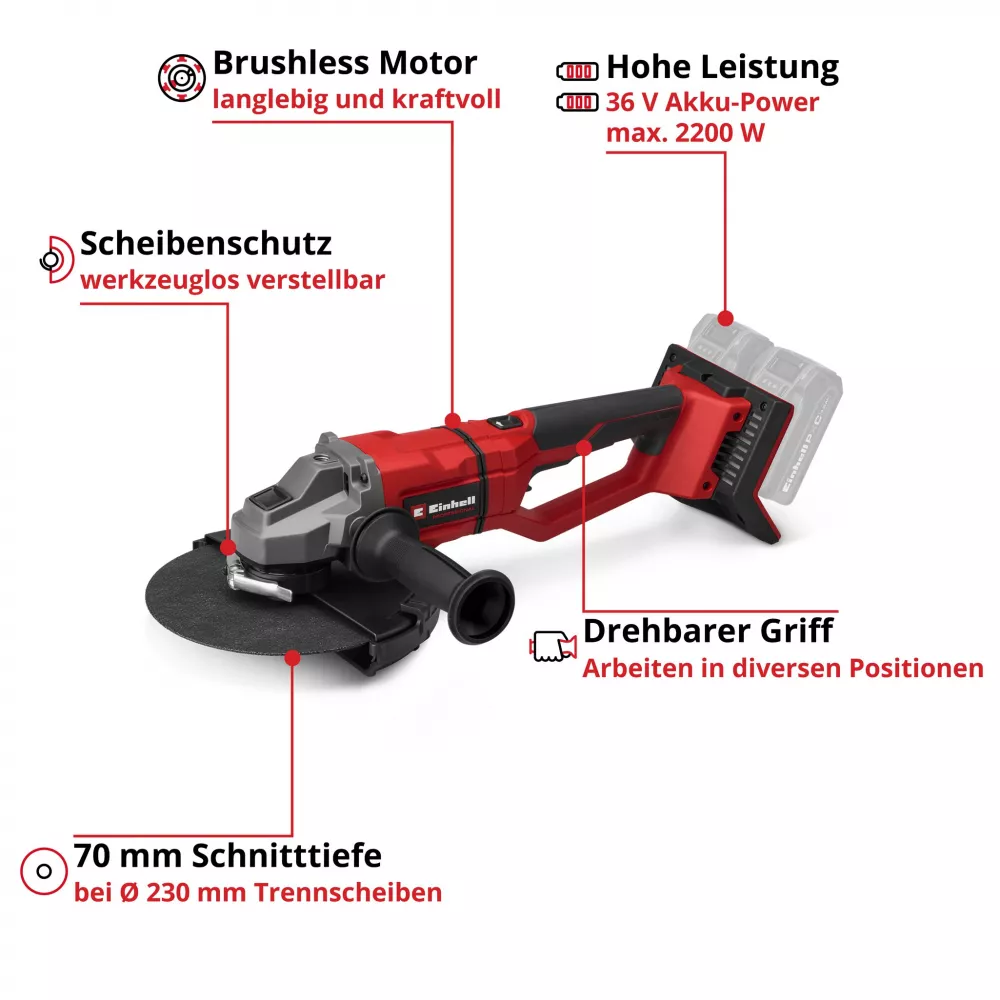 Опис Акумуляторна болгарка 230 мм Einhell Professional TP-AG 36/230 Li BL