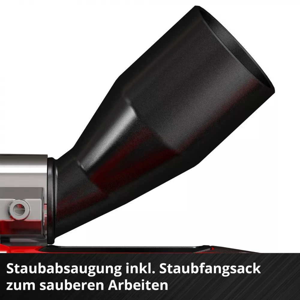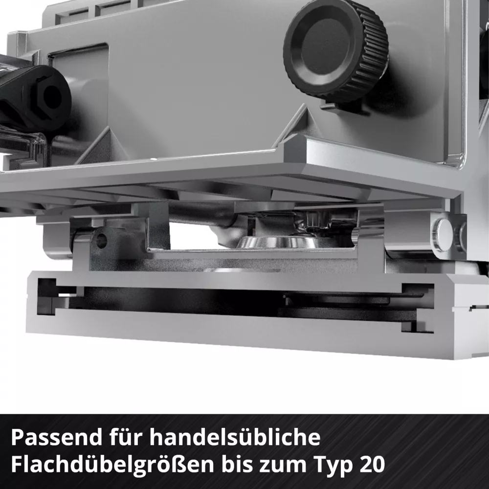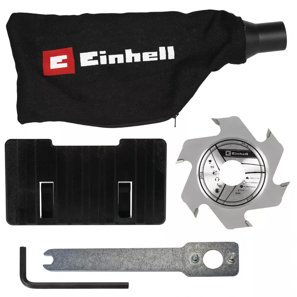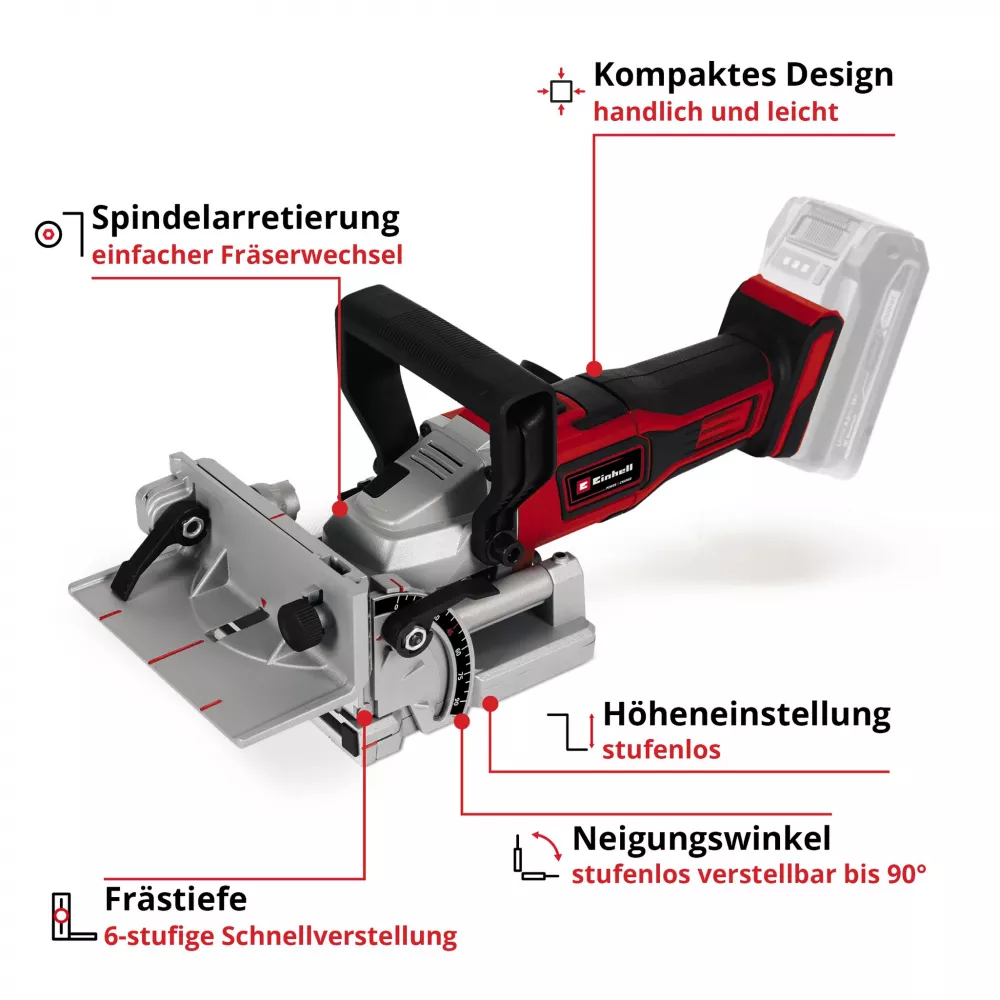 Фрезер ламельний акумуляторний Einhell TE-BJ 18 Li - Solo для плоских шкантів (ламелей) призначений для фрезерування пазів у масивній деревині, клеєній фанері та стружкових плитах, може використовуватись незалежно від джерела живлення. Складні конструкції можливі завдяки безступінчастій установці кута 0 – 90° та висоті фрезерування 0 – 40 мм. Глибина фрезерування може бути легко встановлена на 6-ступінчасте регулювання глибини різу до 20 мм, використовуючи функцію швидкого налаштування. Блокування шпинделя дозволяє легко змінювати фрези. В комплект поставки входить торцевий ключ та мішок для пилу. Інструмент поставляється без акумулятора та зарядного пристрою, але може бути приведений у дію за допомогою Power X-Change акумулятора.
