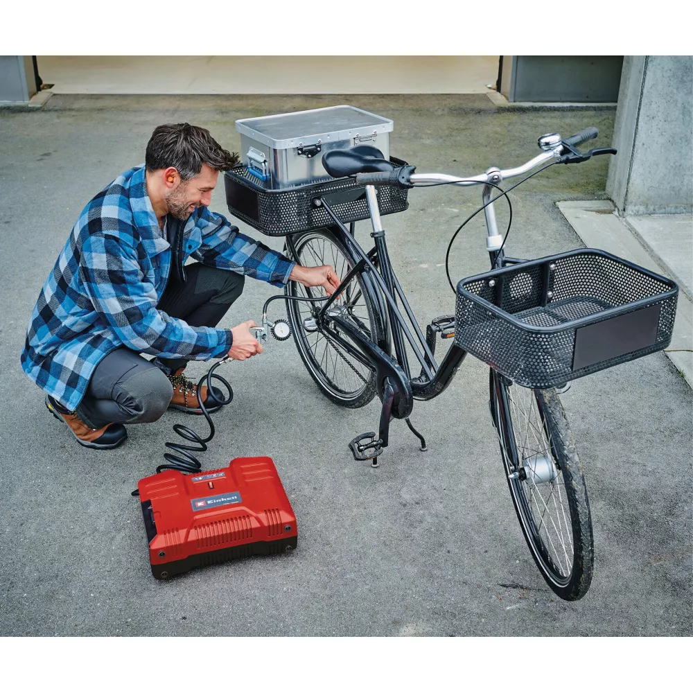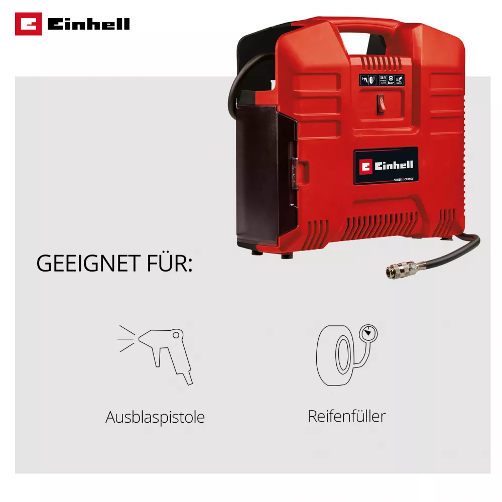 Компактний переносний акумуляторний безмасляний компресор Einhell TE-AC 36/8 Li OF Set-Solo підходить для робіт із застосуванням стисненого повітря з максимальним тиском до 8 бар, що робить його придатним для швидкого закачування шин велосипедів, автомобілів та мотоциклів. Ергономічний дизайн та практична ручка забезпечують мобільність та зручність транспортування. Безмасляний насос, що не потребує обслуговування. Відсік для зберігання стисненого шланга повітря вбудований у корпус. Для адаптерів передбачено додатковий відділ зберігання. Насадку накачування шин можна зручно розмістити на корпусі. В комплект поставки входить шланг стисненого повітря довжиною 2,5 метра зі швидкісним з'єднанням, адаптер для використання як продувний пістолет, а також манометр шин і набір з трьох адаптерів. Для роботи компресора потрібні 2 акумулятори Power X-Change 18 В. Інструмент поставляється без акумуляторів та зарядного пристрою, але він може бути приведений у дію за допомогою Power X-Change акумуляторів.
