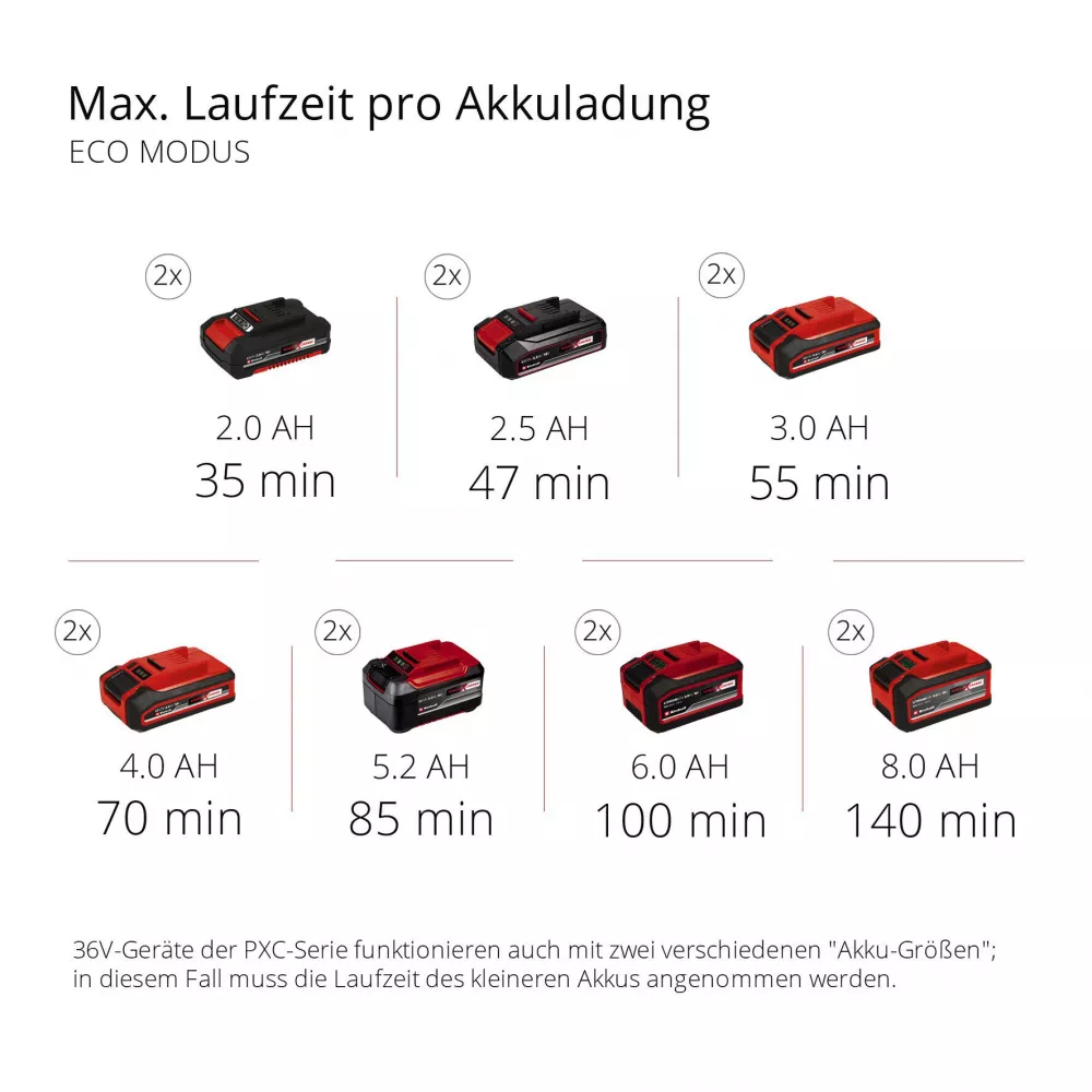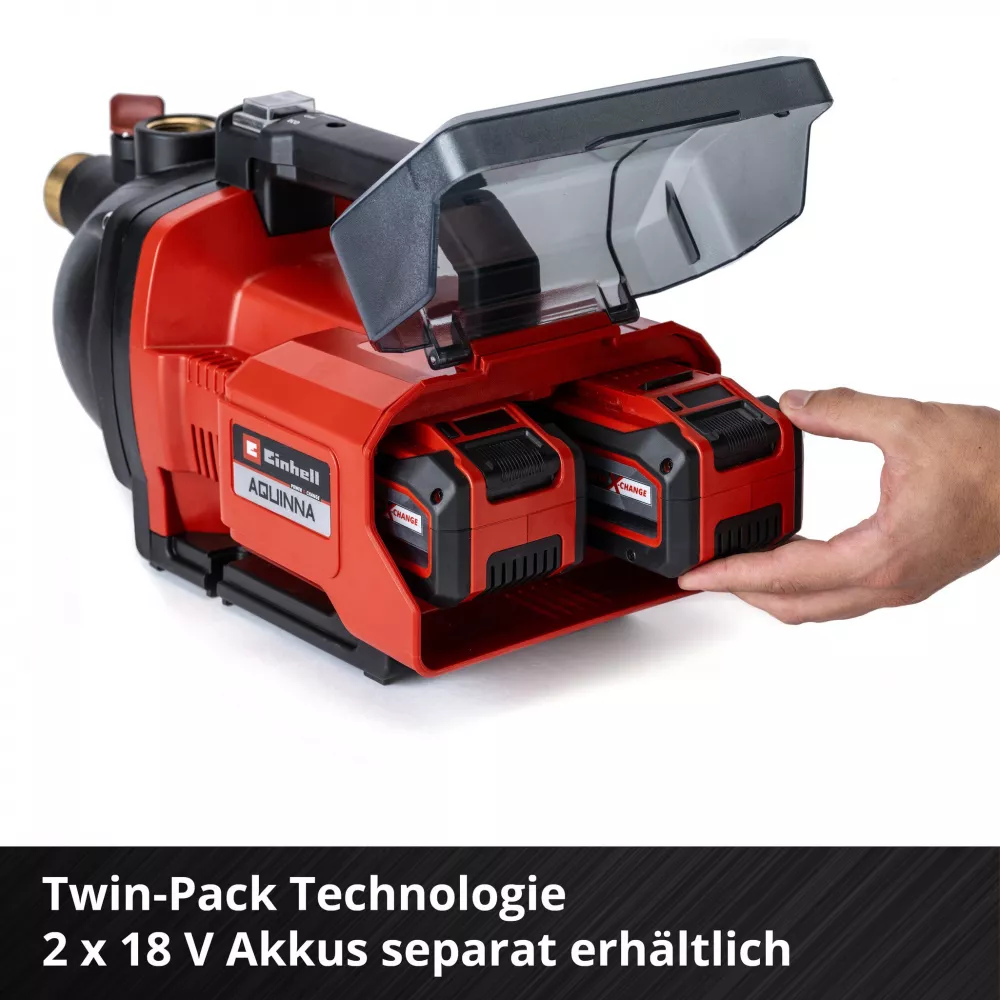 Самовсмоктувальний насос садовий акумуляторний Einhell AQUINNA лінійки Power X-Change system серії Expert plus призначений для зрошення, поливу саду або подачі води з резервуарів. Садовий насос AQUINNA живиться від двох 18В акумуляторних батарей PXC із захистом від перегріву та забезпечує максимальну продуктивність 3000 л/год при тиску до 2,6 бар. Є гвинт для заливки води, а також захист від замерзання завдяки зливному гвинту. Eco режим зменшує максимальну висоту подачі до 17 м та максимальний тиск до 1,7 бар, але при цьому збільшується час роботи насоса на одному заряді. Завдяки зручній ручці для перенесення насос садовий акумуляторний Einhell AQUINNA можна швидко перенести туди, де він необхідний. Насос живиться від двох 18-вольтових батарей . Інструмент поставляється без акумуляторів та зарядного пристрою.